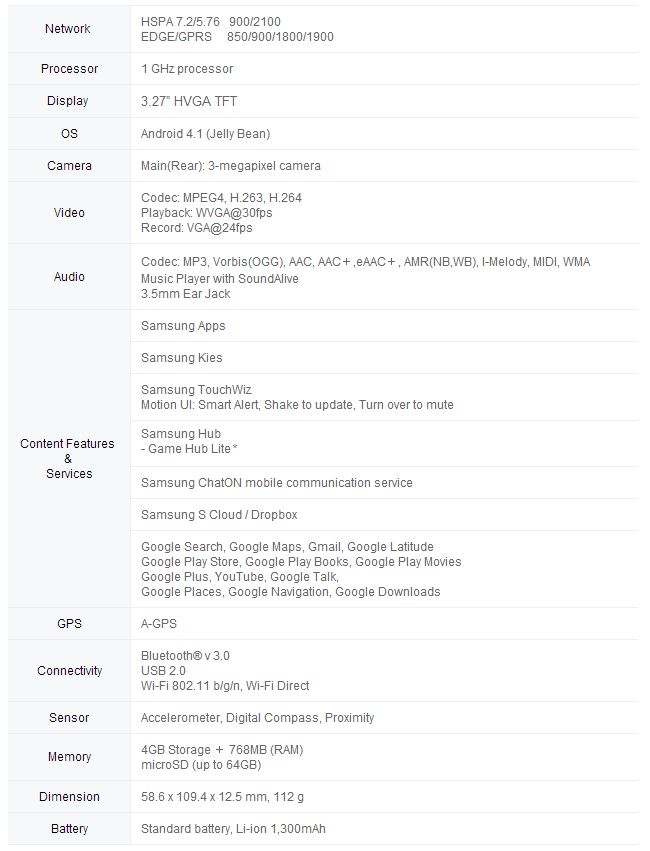 Eccovi tutte le caratteristiche complete dello smartphone Samsung Android :